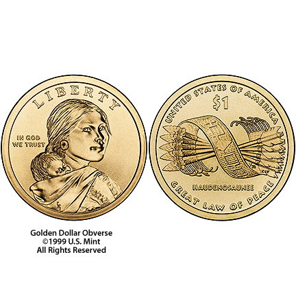 The sacagawea dollar also known as the golden dollar is a united states dollar coin first minted in 2000 although not minted for general circulation until 2002 to 2008 and again from 2012 onward due to its general unpopularity with the public and low business demand for the coin. The mint produced sacagawea and native american 1 coins at three different mints. It says haudenosaunee united states of america and great law of peace but it has no date or stamp where it was made.